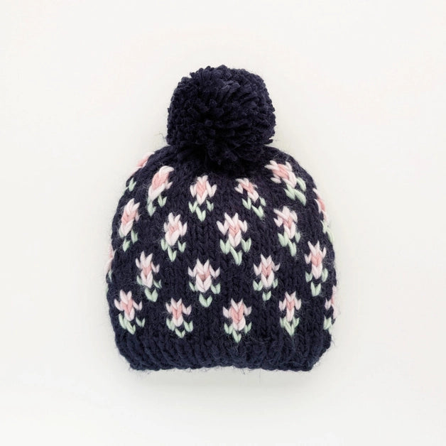 Boasting a design adorned with delicate rosy pink flowers and mossy green leaves, this hat is complete with a fluffy matching pom pom.