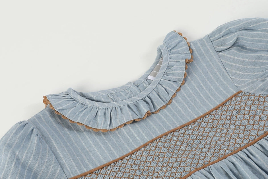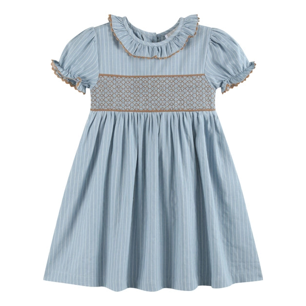 Let your sweet girl dress to impress in this Blue Pinstripe Smocked Ruffle Collar Dress! The smocked chest and tie bow back give pretty details while the ruffle collar adds a touch of whimsy. Perfect for any little girl looking to make a stylish statement.