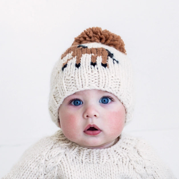 This handknit hat features a charming Pecan Brown Pony design on the front, made from chunky Natural hued yarn. The hat is adorned with a matching Pecan colored yarn pom pom on top, adding a playful touch to the design.