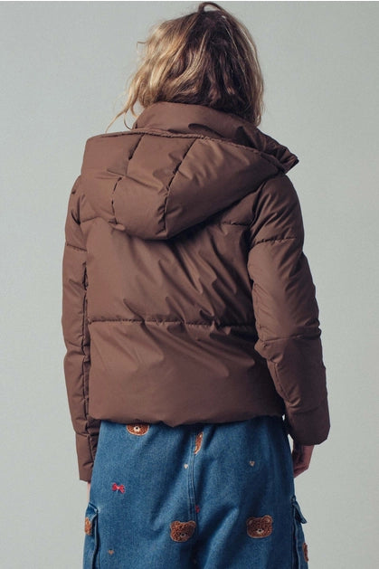 A chic winter layer with a modern matte finish, this padded jacket features a stand collar, adjustable drawstring hood, and a relaxed zip-front silhouette. It’s built for warmth, movement, and effortless city-ready style.