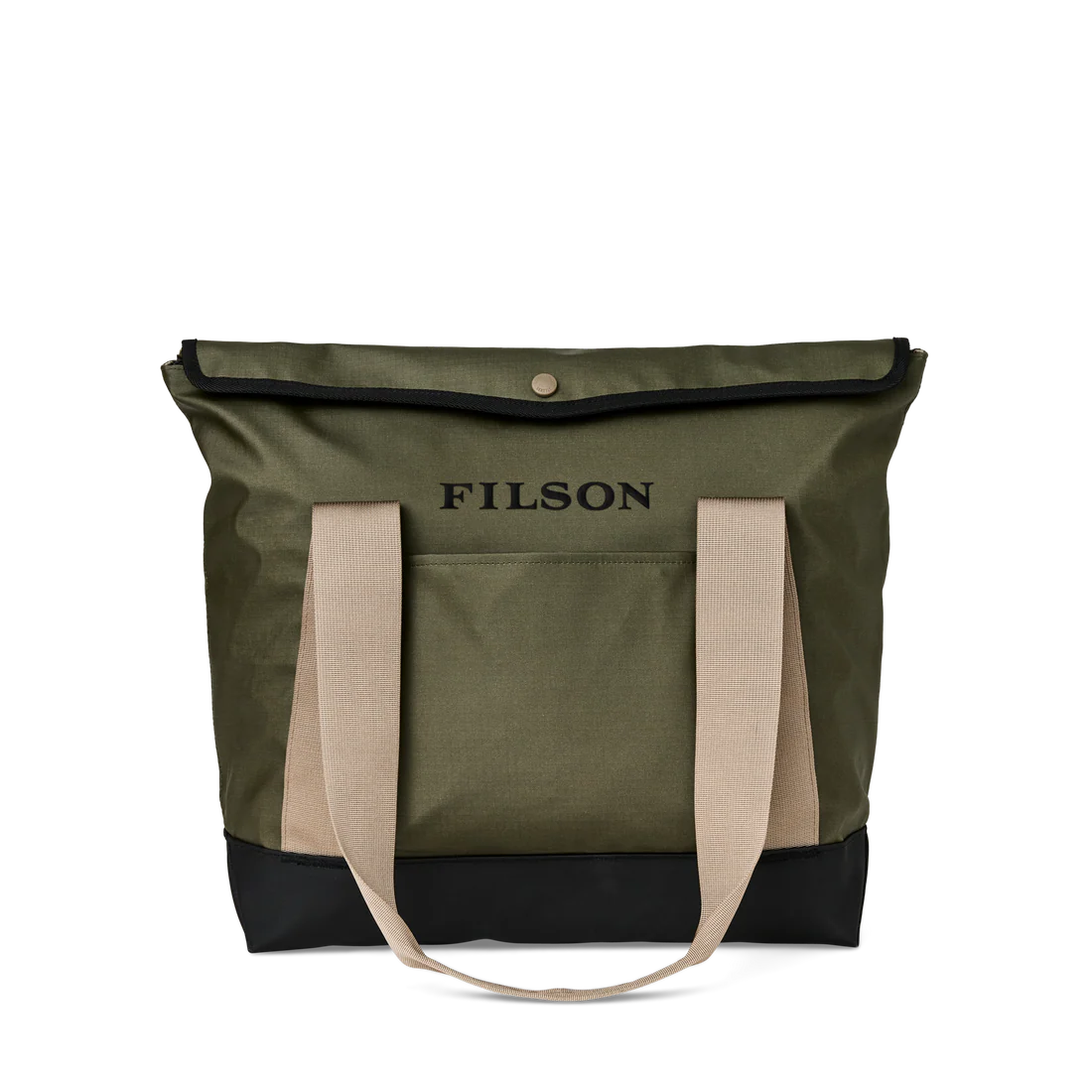 This versatile tote is made to keep gear dry through any weather. The main material is 300D polyester ripstop and the bottom boot is heavy-duty 600D polyester Oxford cloth. These fabrics are made with fully recycled material and treated with thermoplastic polyurethane (TPU) for water resistance.